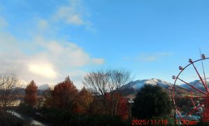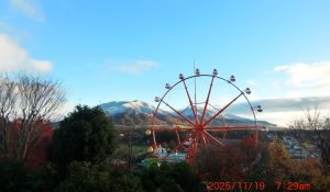 歩いて5分、蒜山三座、牧場の牛の群れを見て遊園地へ。